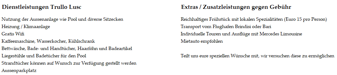 Bis 30 Tage vor Anreise entstehen keine Kosten. Für Annullierungen weniger als 30 Tage vor Anreise entstehen Kosten in der Höhe von 80% des vereinbarten Preises, falls der Trullo Casa Lusc nicht weitervermietet werden kann.